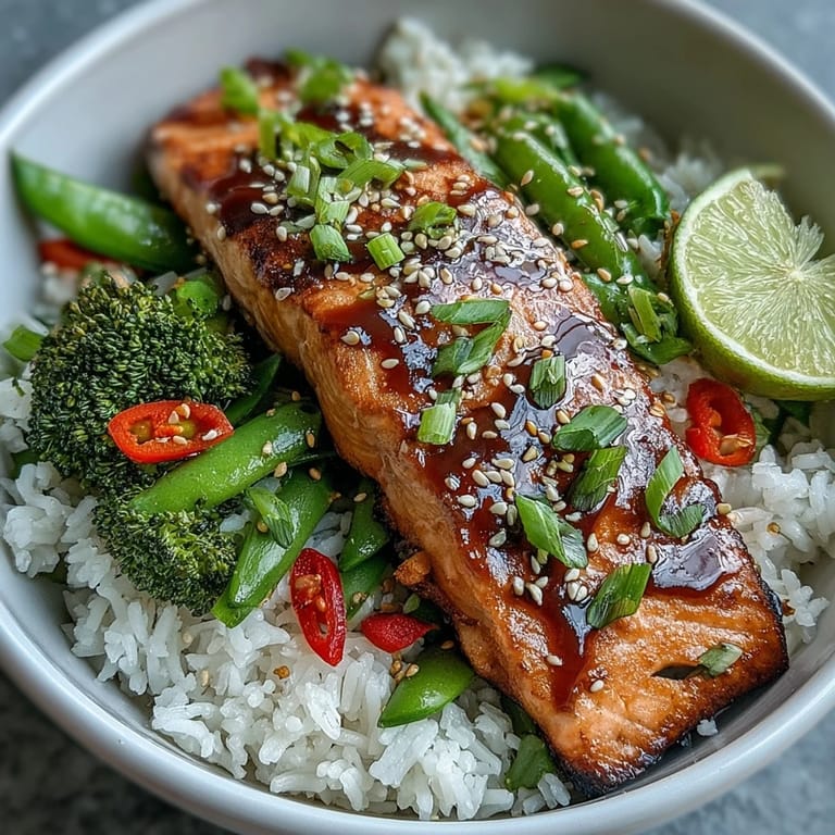 - Divide the fluffy rice among bowls, top with the colorful vegetables, and place your glazed salmon on top, then drizzle any remaining glaze from the pan over everything. Finish with green onions, toasted sesame seeds, and a lime wedge on the side.