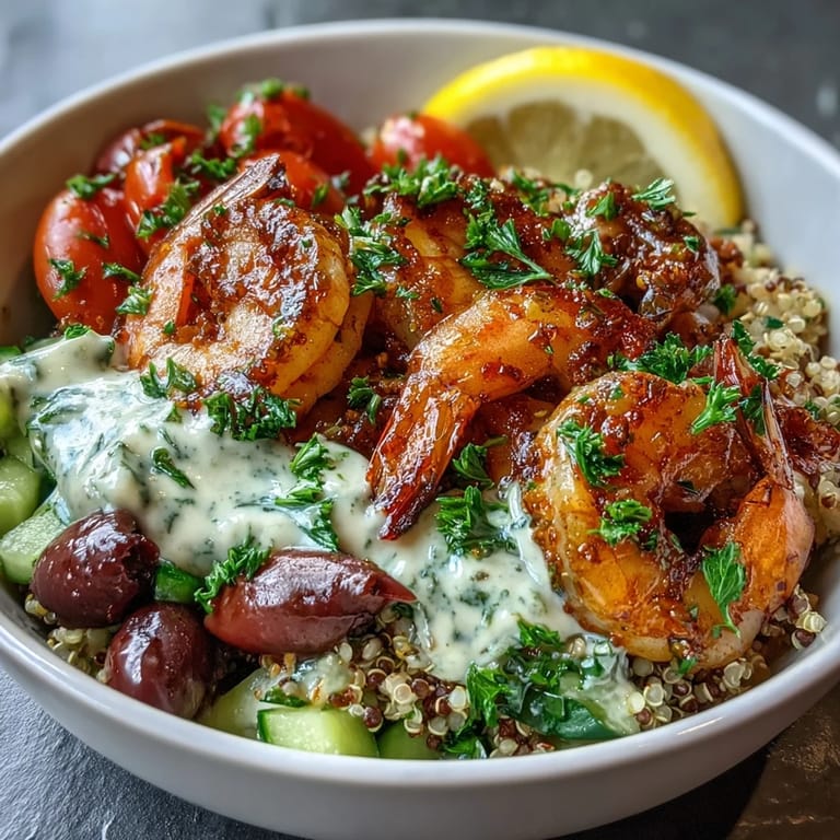 Save to Pinterest There's something about a Mediterranean bowl that feels like putting together a puzzle where every piece actually belongs. I discovered this particular combination on a random Tuesday when my fridge was overflowing with vegetables and I had some shrimp that needed cooking, so I just started layering things together. The tahini sauce was an afterthought, something I whisked up because it seemed right, and it turned out to be the thread that tied everything together in the most unexpected way.