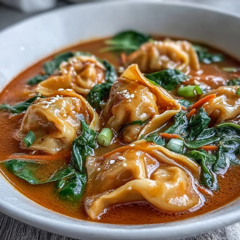 Save to Pinterest There's something almost magical about opening a pot of simmering red curry broth and watching the steam rise up with that unmistakable Thai aroma—ginger, garlic, and coconut melding into something that feels like a warm hug. I discovered this soup on a gray Tuesday when I had exactly twenty-five minutes and a freezer full of wontons, yet somehow it tasted like I'd spent hours coaxing out every layer of flavor. The beauty of it is how effortless it feels to make, even though the result tastes anything but.