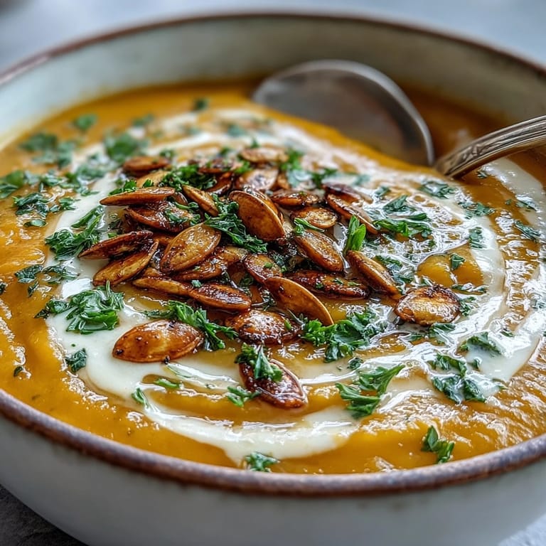 A drizzle of good olive oil on top right before serving makes it feel restaurant quality. The contrast between hot soup and cold garnish is worth the extra step. Toasted pumpkin seeds add crunch that keeps every bite interesting.