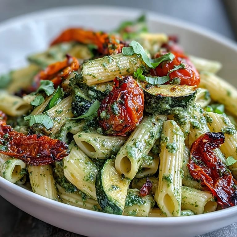 Four servings is what the recipe makes, but I've learned a few tricks for adapting it based on what's in your garden or what your farmer had that morning. The vegetables are the star, so anything roastable works—eggplant, asparagus, cherry peppers, mushrooms, or even broccoli if you catch it at the right moment. Once you understand the ratio of pasta to vegetables to pesto, you can scale it up for a crowd or down for just yourself without losing what makes it special.