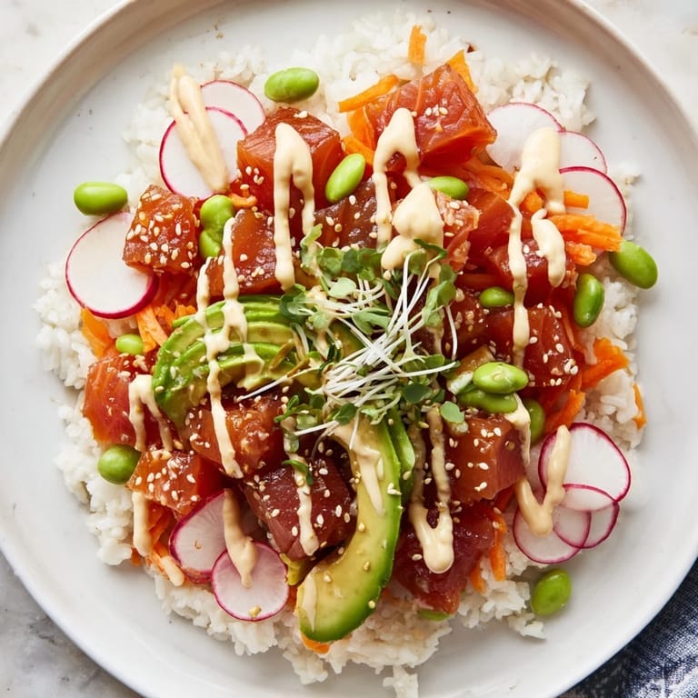 I made this for my partner's team one summer evening, and watching everyone build their own bowl with their own toppings felt like hosting a dinner party without the stress. Someone asked for extra spicy mayo, someone else skipped the fish entirely and piled on edamame instead, and it occurred to me that poke bowls are one of those rare dishes where everyone leaves happy because everyone got exactly what they wanted. That's when I realized this recipe wasn't just about the food—it was about giving people control and letting them feel creative in your kitchen.